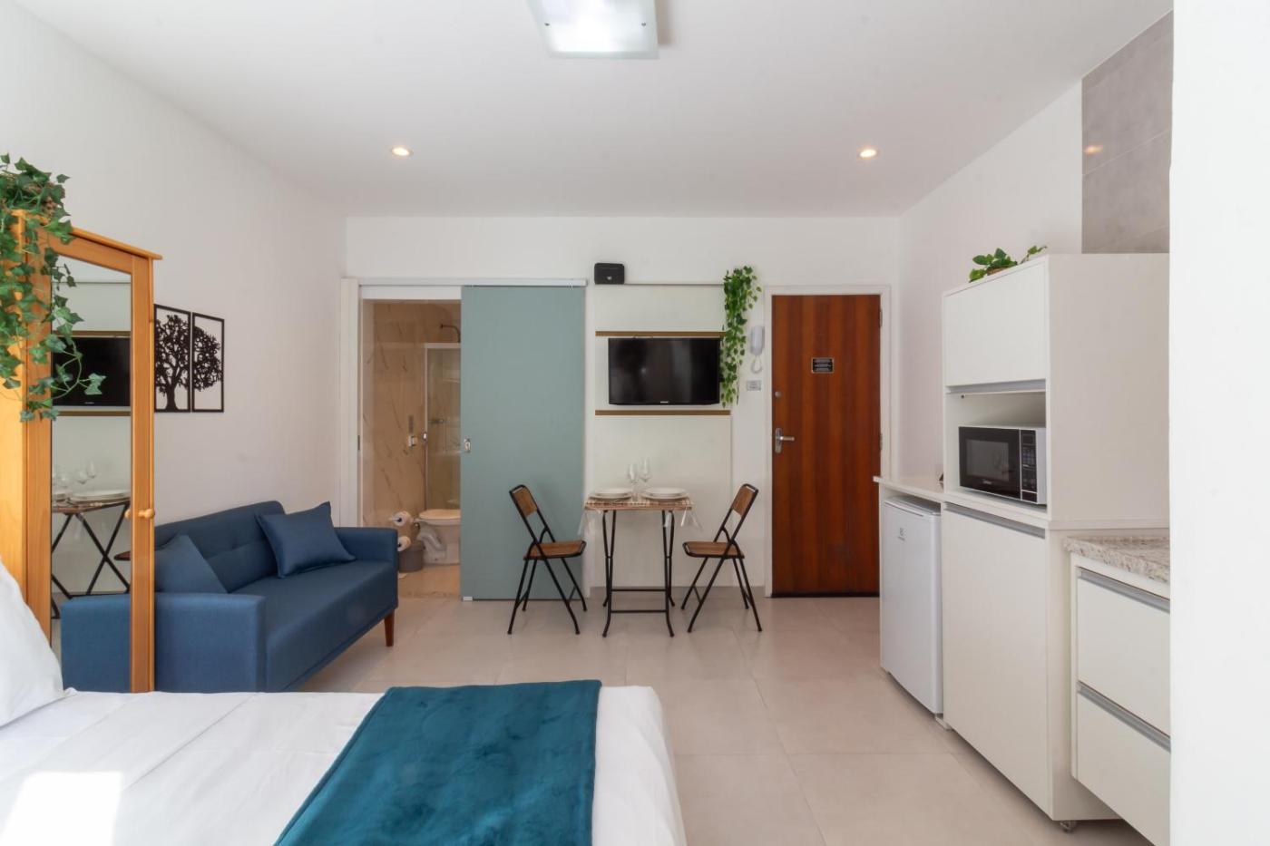 Deluxe Double Studio. The studio offers air conditioning, a private entrance, as well as a private bathroom featuring a shower and a hairdryer. The well-fitted kitchen features a stovetop, a refrigerator, kitchenware and a microwave. The studio features a tea and coffee maker, a wardrobe, a sofa, as well as a TV.